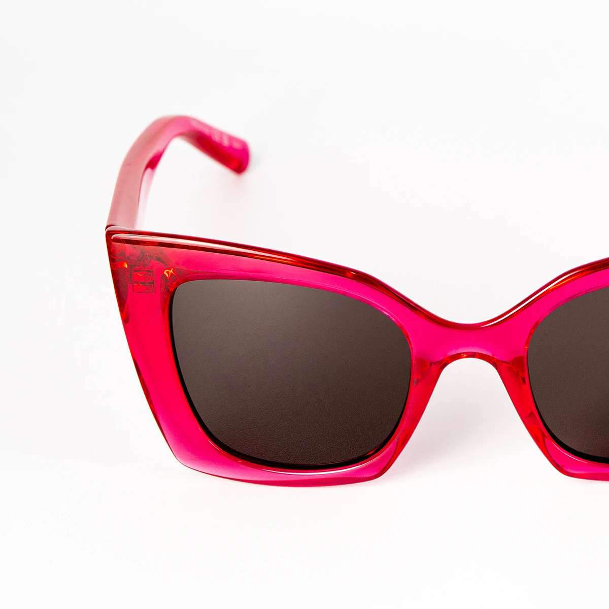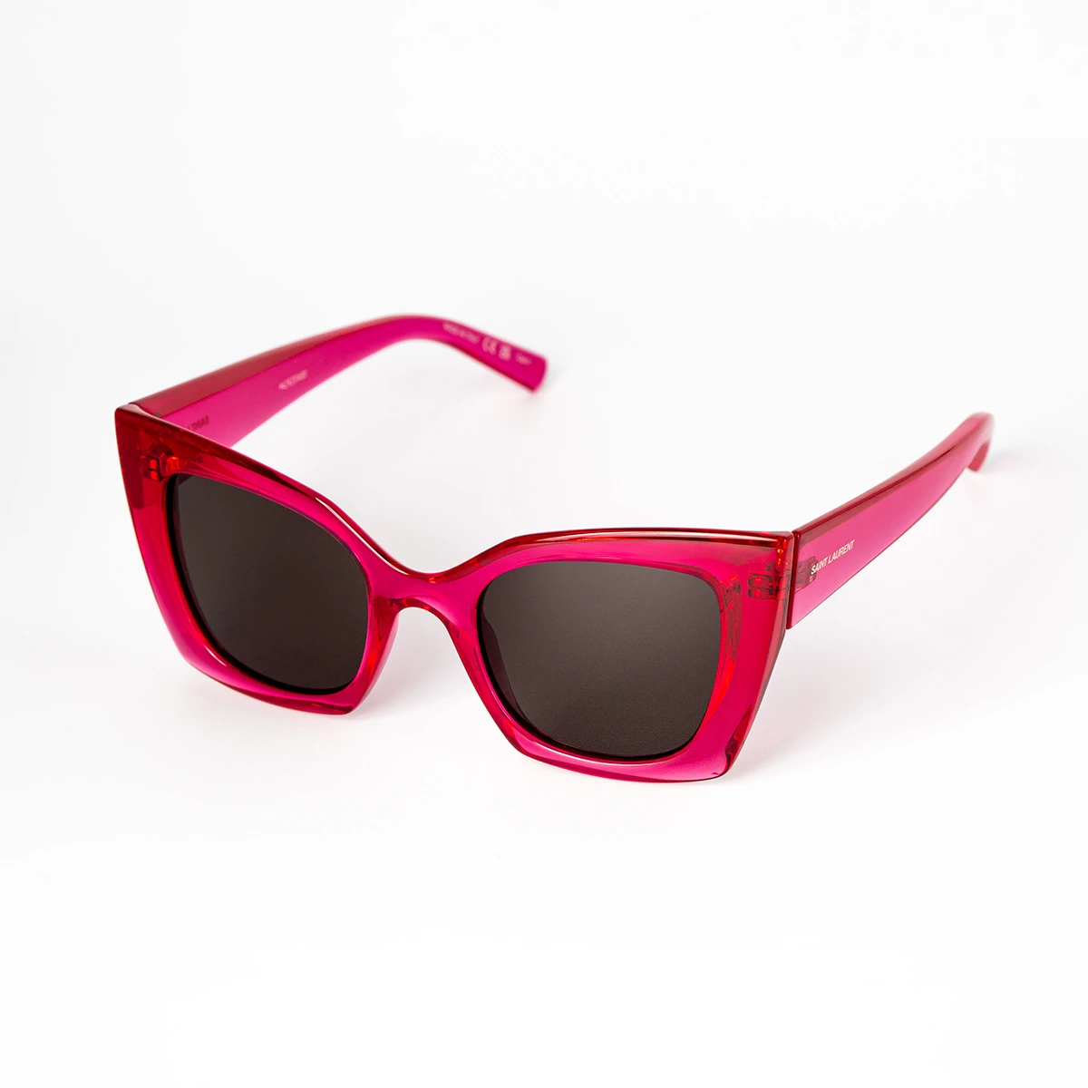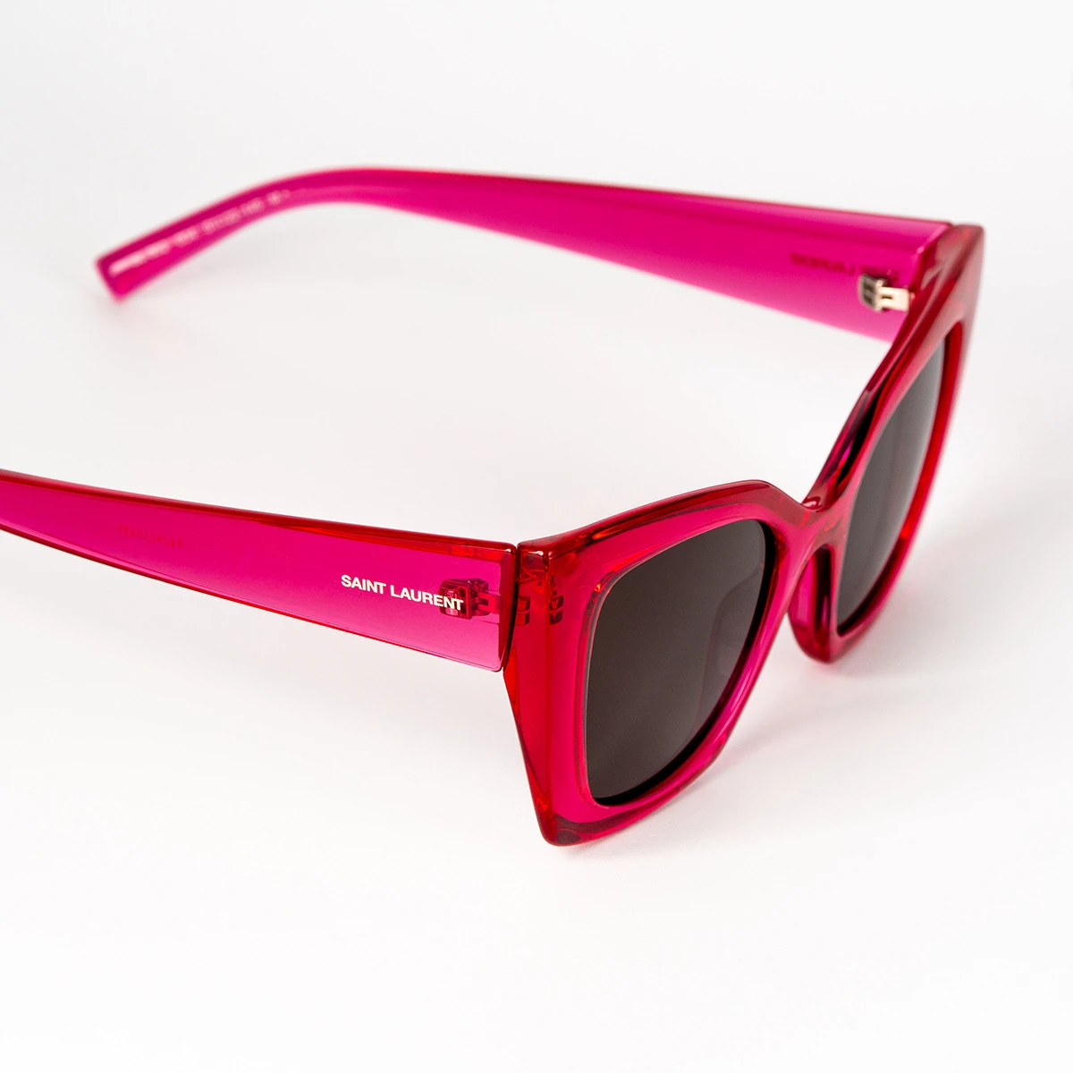 Gli occhiali da sole SL 215 di Saint Laurent hanno uno stile cat-eye deciso e sfrontato. La montatura color fuchsia trasparente presenta delle lenti color grigio che proteggeranno al 100% dai raggi UV il tuo sguardo e non ti faranno passare inosservata. Le aste sono impreziosite dalla firma Saint Laurent.