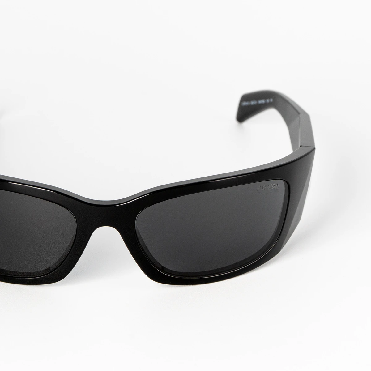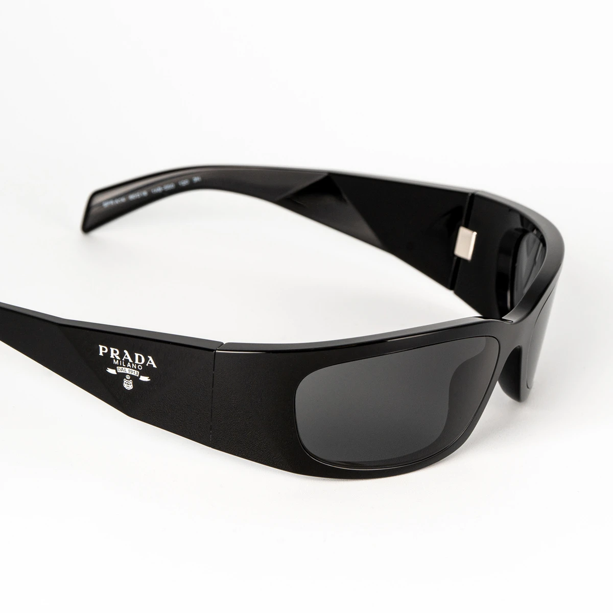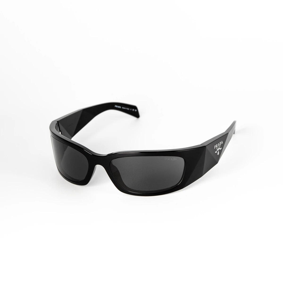 Occhiali da sole Prada con montatura avvolgente nera in propionato dal carattere moderno, audace e alla moda. Le lenti grigio scuro ti proteggeranno dai pericolosi raggi UV. Le aste sono contraddistinte dal logo della maison.