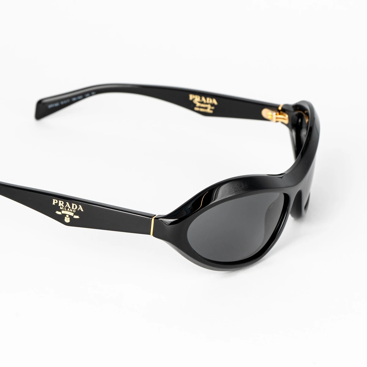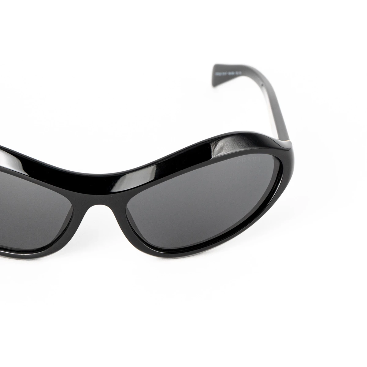 Occhiali da sole Prada con montatura avvolgente nera in acetato dal carattere moderno, audace e alla moda. Le lenti grigio scuro ti proteggeranno dai pericolosi raggi UV. Le aste sono contraddistinte dal logo della maison.