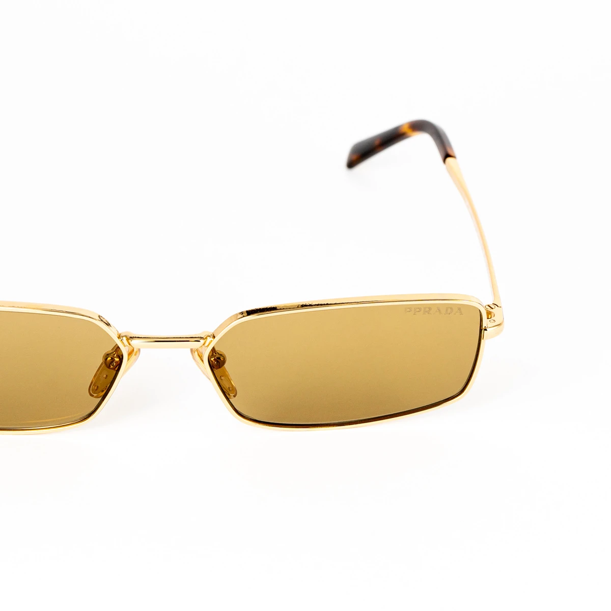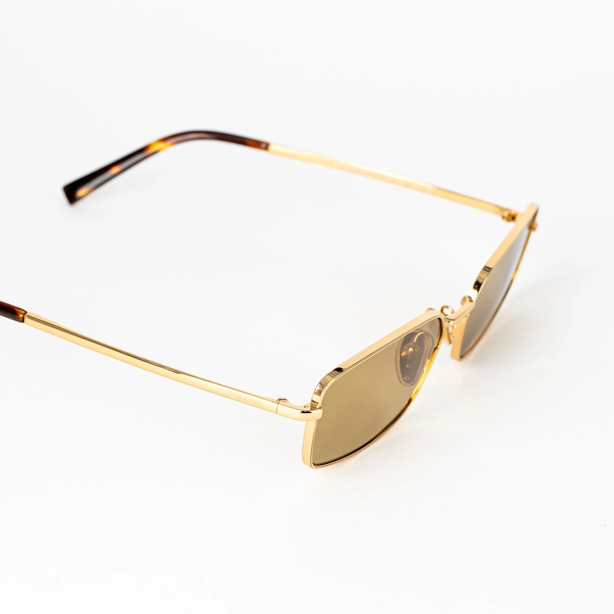 Occhiali da sole Prada con montatura in metallo dorato dal carattere moderno, audace e alla moda. Le lenti verde oliva ti proteggeranno dai pericolosi raggi UV. Le aste sono contraddistinte dal lettering Prada finemente inciso.